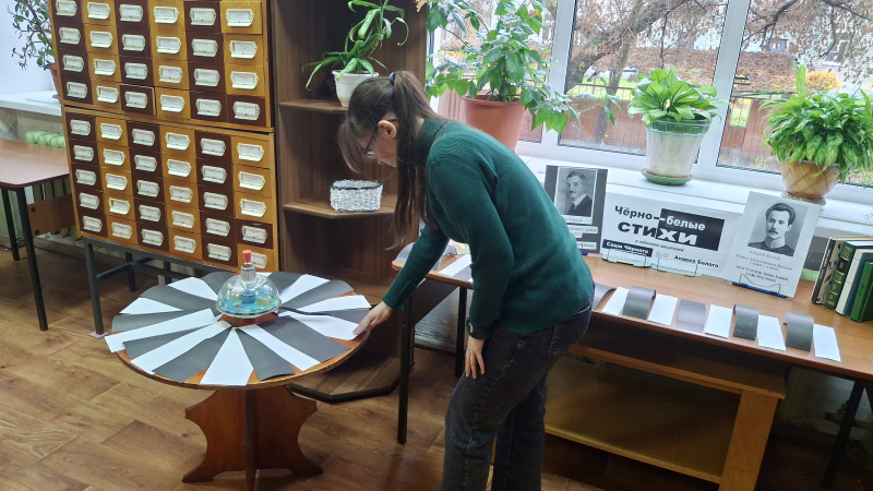Глядя на чёрные ветки на фоне серого неба, унылые монохромные оттенки, сменяющие буйство красок осени, поневоле вспомнишь пушкинское: «…приближалась / Довольно скучная пора». А мы в библиотеке организовали «чёрно-белую» акцию – но не унылую, а очень даже познавательную. И посвящалась она сразу двум авторам-юбилярам, родившимся в один год и в один месяц с разницей в тринадцать дней: Саше Чёрному и Андрею Белому. Каждому нынче по 145 лет.
