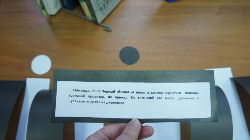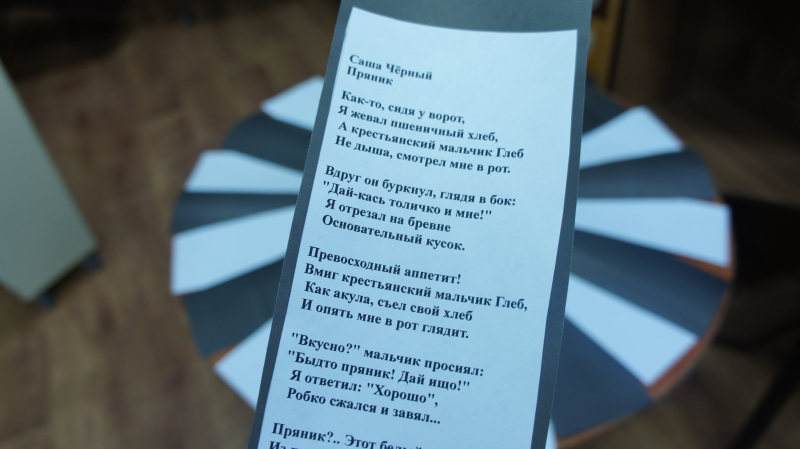 А насколько же сами поэты отличались друг от друга? Об этом участники акции узнали, пройдя по «зебре фактов» и отмечая особенно понравившиеся из них фишками соответствующего цвета. И с удивлением обнаруживали, что во многом эти два автора были схожи: оба покидали Россию, оба прожили мало и примерно одинаково, оба в своем творчестве боролись с одним врагом – людской пошлостью и бездуховностью. Практически литературные близнецы! Но и отличий, разумеется, тоже хватает: и вот тут выясняется, что в Белом – довольно много чёрного, а в Чёрном – белого. Слывя желчным мизантропом и циником, Саша Чёрный при этом вёл себя с окружающими порядочно и корректно, а ещё просто обожал детей (чужих, ибо своих не было) и прославился в том числе и как детский писатель. А Андрей Белый, «пташка Божия», влюблялся в замужних дам и даже пытался увести жену у Блока.