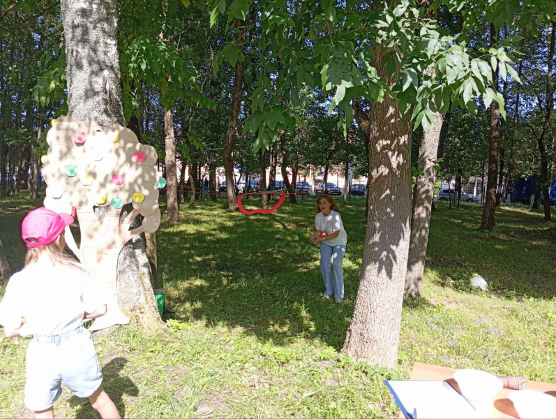 Об этом мы рассказали ребятам и предложили игру на меткость. Участники должны были попасть мячом в мишень в виде яблока. Не попал - ответил на вопрос о литературных героях. Но и, конечно же, каждому меткому и не очень меткому стрелку досталось по сладкому призу.