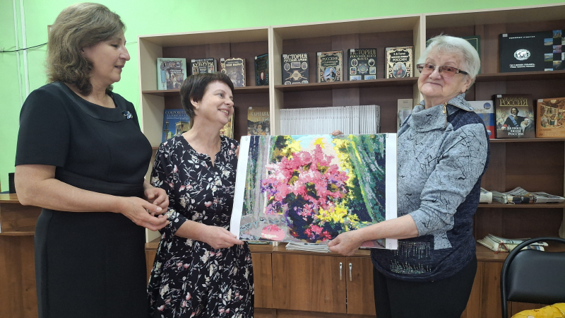 Но наши гости были не просто зрителями, а полноправными участниками мероприятия. Конкурсы, фанты, музыкальные викторины, загадки, песни, частушки – всё по плечу этим энергичным и неунывающим дамам. За активное участие в культурной жизни библиотеки мы вручили благодарственное письмо клубу «Вдохновение». А гости подарили нам картину из алмазной мозаики, выполненную своими руками.
