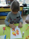 Поговорив о красоте, принялись за работу. Для начала выбрали фон для поделки. Потом понадобилась цветная бумага: белая для ствола, оранжевая и желтая – для кроны. Стволы у березок сделали объемными. Оживили стволы и принялись за крону. Нарезали бумагу на полоски и закручивали. Ребята трудились с большим интересом. Работы получились очень красочными.