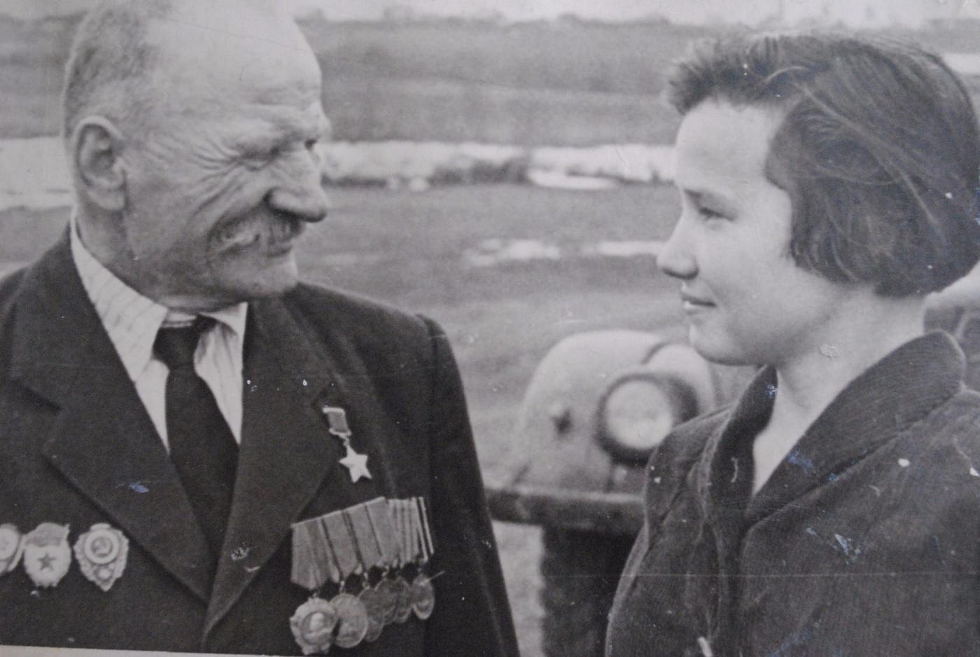 Однажды к нам в Дунаевскую среднюю школу привезли документальный фильм о Великой Отечественной войне, который мы посмотрели на уроке истории. Вдруг на экране крупным планом показали бойца в каске, с биноклем в руках. «Да это же наш дедушка!» — воскликнула я. Сразу же послали за дедушкой. Еле сдерживая слёзы, смотрел он на себя, командира отделения 252-го мотоинженерного батальона 57-ой армии, молодого, сильного. Фильм прокрутили несколько раз, предложили даже один кадр вырезать и оставить на память, но дедушка отказался.