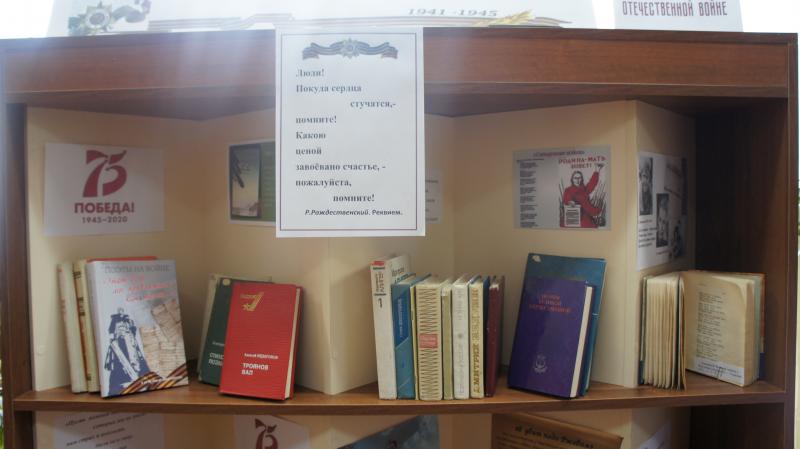 Эпиграфом к выставке стали слова Р. Рождественского «Люди, покуда сердца стучатся, помните!...». Выставка состоит из нескольких разделов, названиями которых служат стихотворные строки А.Твардовского и Ю. Друниной, В. Лебедева - Кумача и Н. Майорова. Так, в разделе «Пусть помнят те, которых мы не знали…», представлены поэтические сборники разных поэтов, писавших о войне. А вот в разделе «На войне одной минутки не прожить без прибаутки…» - поэма А. Твардовского «Василий Тёркин» и трогательное стихотворение Э.Асадова «Землянка». Многих поэтов, чьи стихи представлены на этой выставке, объединяет то, что они знали о фронтовых буднях не из рассказов очевидцев или из сводок Совинформбюро; стихи эти рождались на поле боя, в траншеях и блиндажах. Они пахнут порохом, они пронизаны искренними человеческими чувствами: болью за родную землю, скорбью по погибшим товарищам, тоской по близким. И строки эти не фальшивят. Известная поэтесса Ю. Друнина писала: «Я столько раз видала рукопашный, раз на войне и тысячу во сне, кто говорит, что на войне не страшно, тот ничего не знает о войне». Юлия Друнина со школьной скамьи, в 17-летнем возрасте, ушла на фронт. До ранения в 1944 году, была батальонным санинструктором. Демобилизовалась сержантом медицинской службы, поступила в Литературный институт и написала много стихов, наполненных памятью о войне, надеждой и добротой.