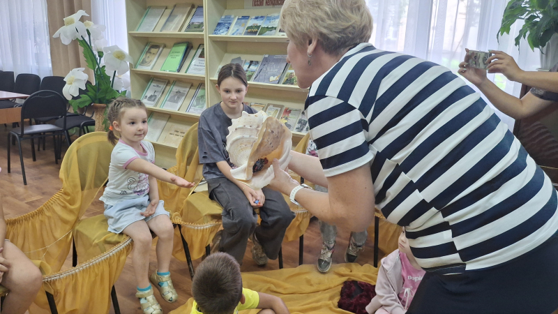 Сегодня в читальном зале Центральной библиотеки ребята из семейного центра и клуба «Мастерская счастья» расположились на песчаном побережье, чтобы окунуться в морские глубины и ближе познакомиться с морскими обитателями.