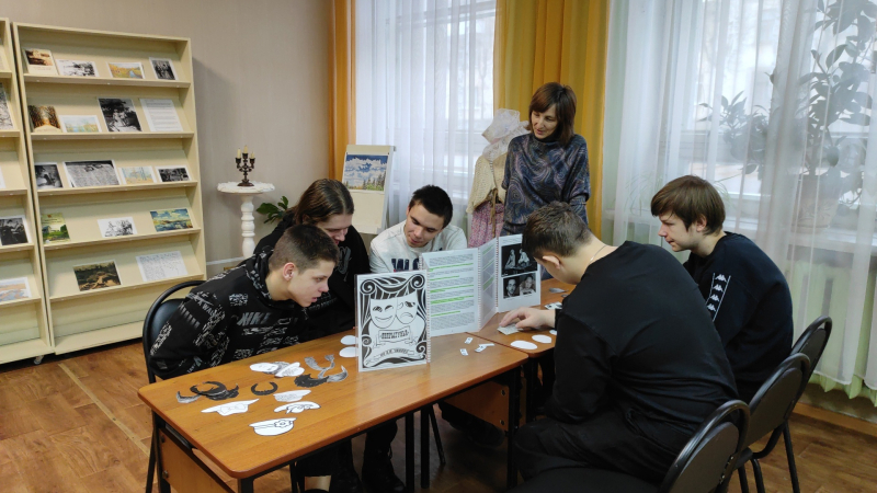 В зале абонемента было две игровые зоны – «Кушать подано!» и «Юмор сквозь чеховское пенсне». На первой точке, красочно и аппетитно оформленной, по отрывкам из произведений нужно было угадать блюдо и название рассказа, в котором оно описывается. Здесь еще и конфеты давали для подкрепления сил! И силы точно потребовались, потому что далее нужно было пройти мини-квест: по смешным цитатам в стенгазете требовалось найти 8 подсказок – кусочков самой известной чеховской фразы. А заодно и потренироваться писать старинными письменными принадлежностями «Письмо на деревню дедушке».