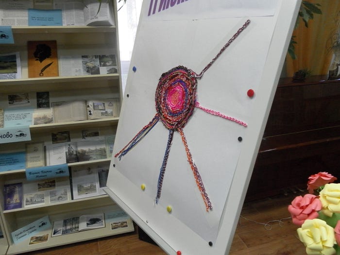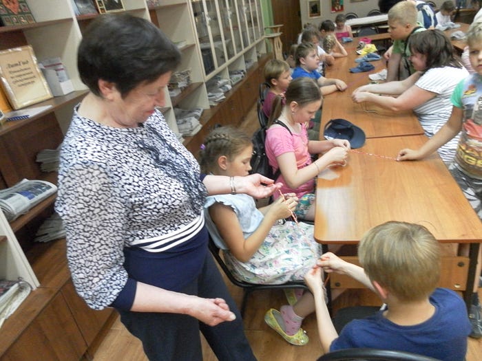 В гости в Центральную библиотеку пришли ребята из пришкольного лагеря Гимназии, чтобы попробовать свои силы в удивительном рукоделии. Каждый ребенок в этот день должен был сплести… косичку из шерстяных ниток. Из большого количества маленьких косичек, которые сделали наши юные посетители, получилось одно прекрасное разноцветное шерстяное солнце на листе ватмана. Эту эмблему праздника пришедший отряд мог забрать с собой в качестве подарка. То есть получился самый настоящий флэш-моб: когда много участников делают что-то одинаковое, а потом из этого получается нечто общее, объединяющее всех.