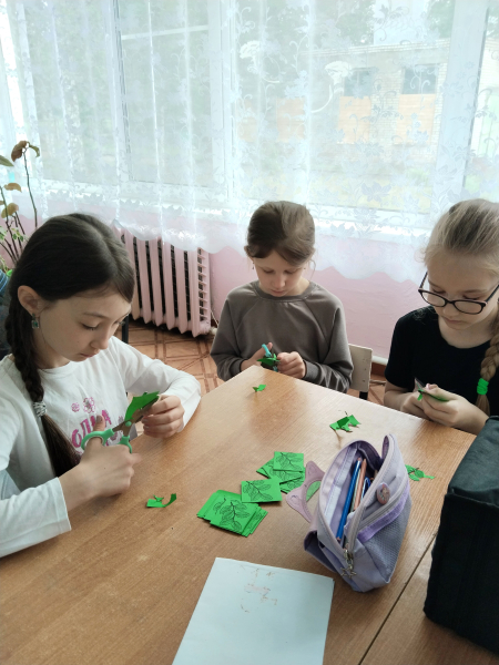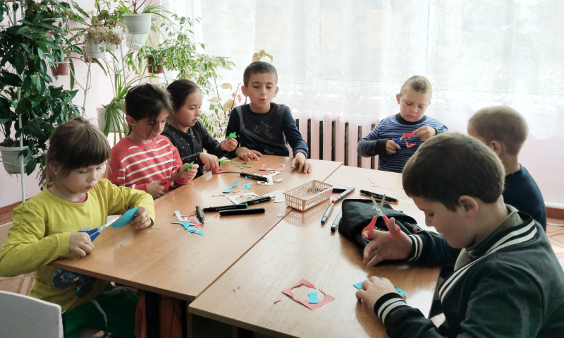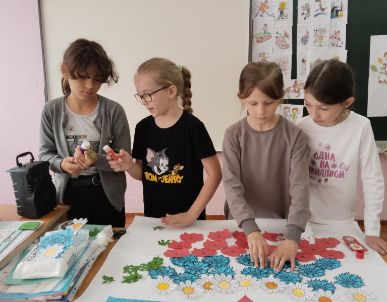 Следующий этап — совместное творчество. Вместе с библиотекарем ребята сделали красочный плакат под названием «Я люблю Россию». Использовались символы России: белоснежные ромашки, синие васильки и красные маки. Именно из цветов сложили флаг нашей Родины. Дополнительно украсили плакат зелёными листьями берёз и очаровательными фигурками матрёшек.