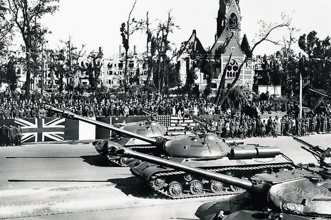 Об историческом Параде Победы в Москве 24 июня 1945 года написаны тысячи статей и воспоминаний. Куда меньше известно о победном Параде союзников в Берлине. 7 сентября 1945 года в Берлине состоялся первый и последний совместный парад советских, английских, американских и французских войск.